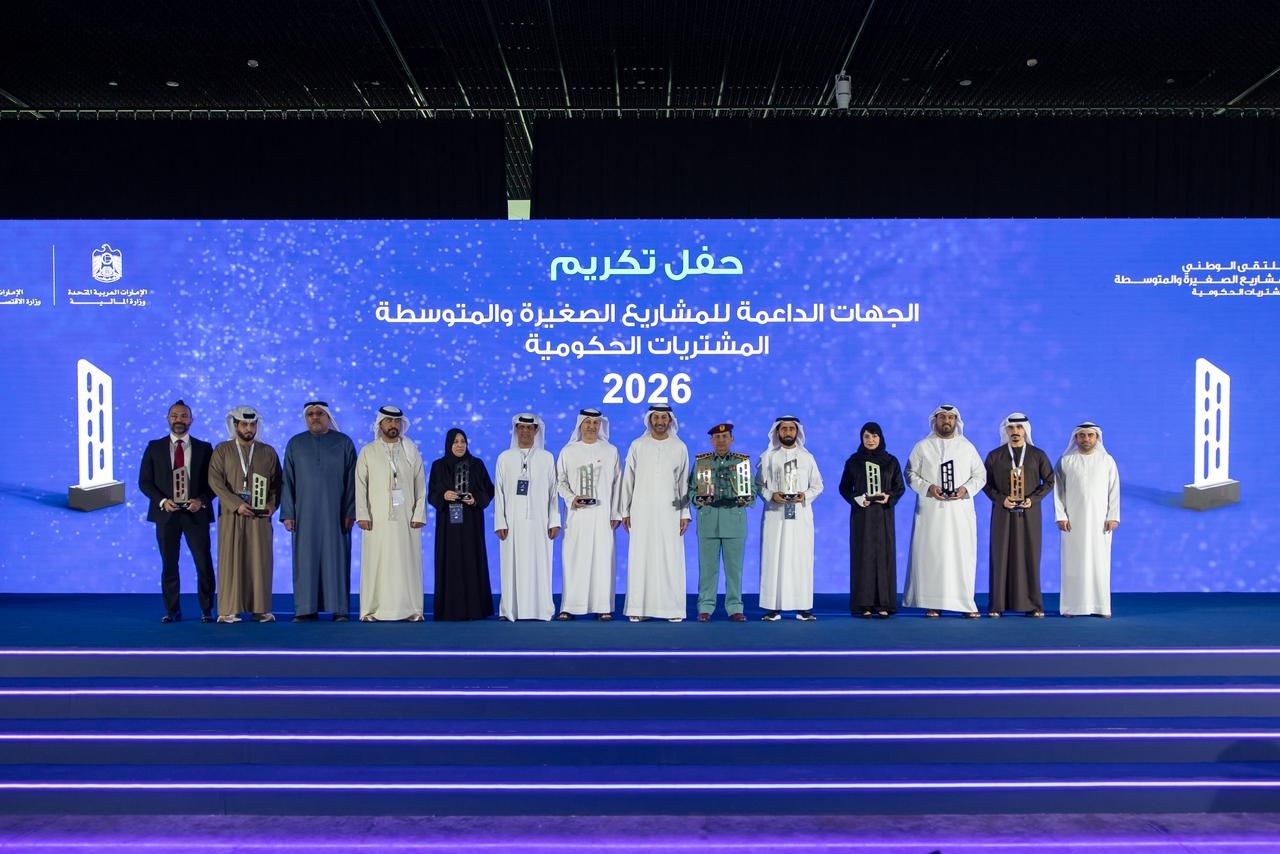 كرّمت وزارة الاقتصاد والسياحة خلال النسخة الثانية للملتقى الوطني للمشاريع الصغيرة والمتوسطة – المشتريات الحكومية 2026، 11 جهة اتحادية وشركة وطنية، وذلك تقديراً لجهودها البارزة في دعم المشاريع الصغيرة والمتوسطة الإماراتية وإتاحة الفرص للحصول على العقود والمناقصات الحكومية خلال العام 2025، بما يسهم في تعزيز منظومة المشتريات الحكومية، وبما يدعم تنمية ريادة الأعمال الوطنية.